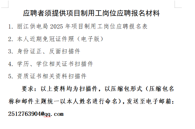 應(yīng)聘者須按照附件3《提交材料清單》提供項(xiàng)目制用工崗位應(yīng)聘報(bào)名材料,填寫(xiě)附件2《麗江供電局2025年項(xiàng)目制用工崗位應(yīng)聘報(bào)名表》,并附本人近期免冠證件照、身份證、畢業(yè)證、資格證書(shū)等相關(guān)材料掃描文件,以壓縮包形式(壓縮包名稱和郵件主題統(tǒng)一以本人姓名進(jìn)行命名),發(fā)送至電子郵箱:2512763904@qq.com。