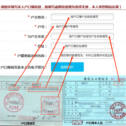特別提醒:為確保申請享受放寬政策人員報名信息審核通過,請按下列示例圖片填寫戶口簿信息。如有戶口簿毀損、手寫痕跡、字體不清、印章模糊等無法識別信息的情況,請盡快到戶籍地公安機(jī)關(guān)重新打印戶口簿,清晰拍照后上傳,避免耽誤報名。