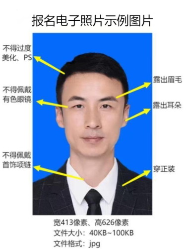 (1)本人近三個月內(nèi)正面、免冠、彩色(藍(lán)、紅、白色底)證件電子照片,照片必須清晰完整,著正裝,電子照片文件類型為jpg格式。電子照片標(biāo)準(zhǔn)尺寸為413像素(寬)×626像素(高)。電子照片文件大小為40KB≤文件大小≤100KB,照片必須清晰完整。證件照片頭部、肩部所占比例約五分之四。