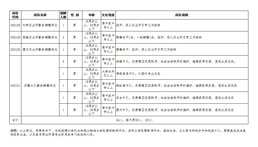 1、招聘名額:64名(男性59名,女性5名),具體崗位詳見招錄計(jì)劃表。